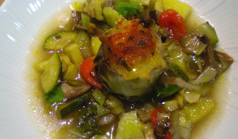 Oven Baked Vegetable Soup with Artichokes Stuffed with Cuttlefish
