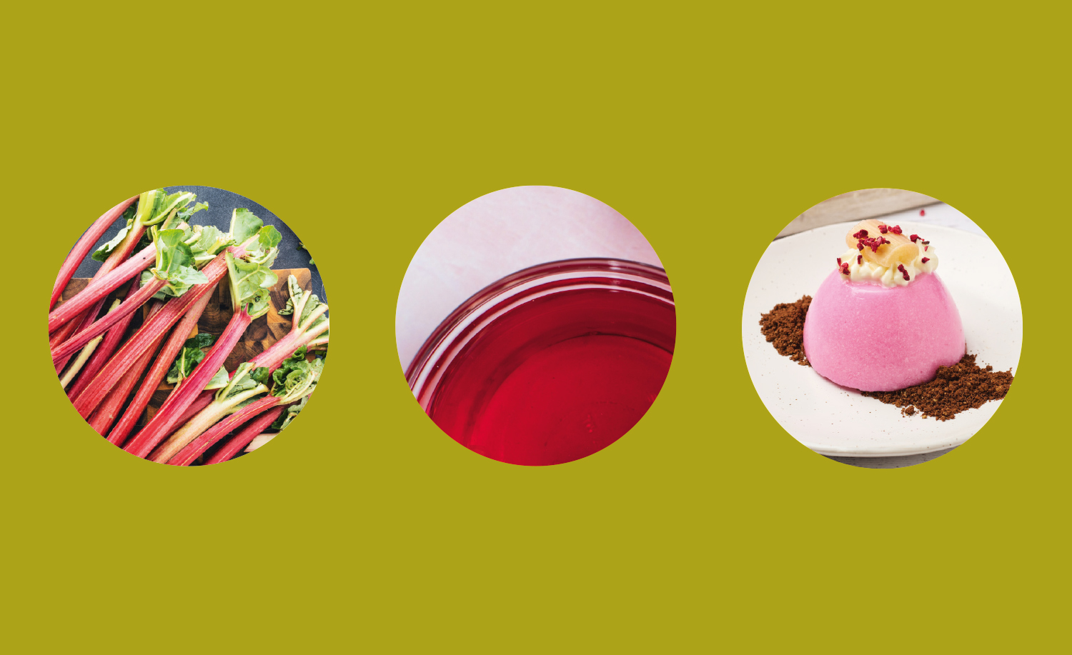 Dissolve raspberry jelly in boiling water. Whisk in mascarpone and ¾ of the rhubarb. Pour into dome moulds sprayed with non-stick spray, and chill until set.