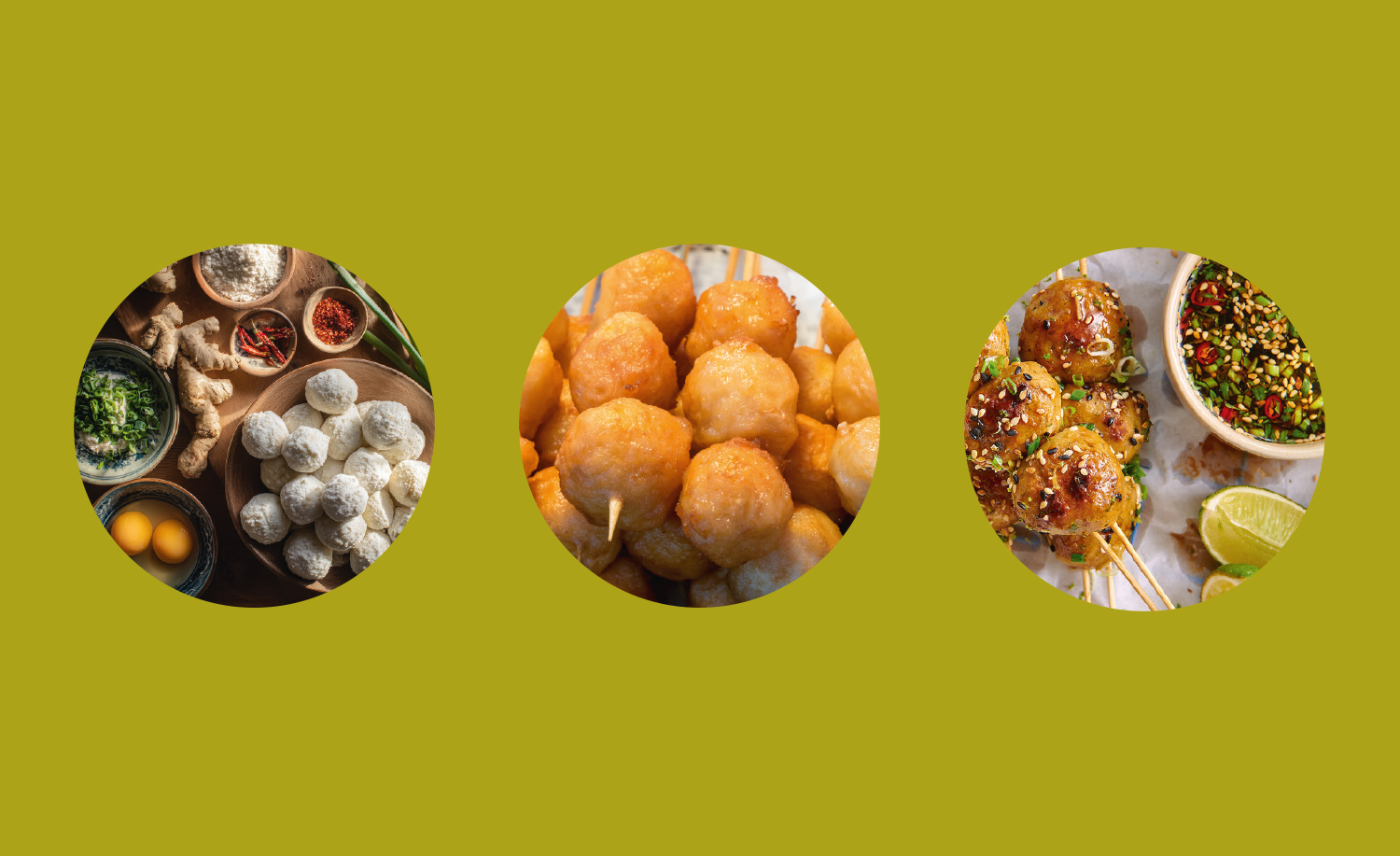 Form balls from the fish mixture. Blanch in boiling water, then add to skewers. Brush with Kikkoman Gluten-free Soy Sauce, sprinkle with sesame seeds and fry.