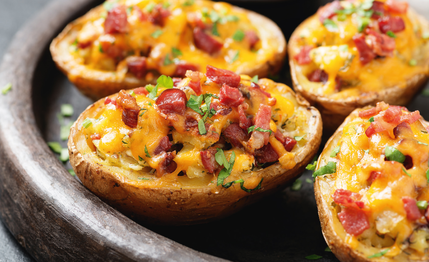 Scoop out leftover baked potato halves, mix the flesh with cheese, herbs or cooked bacon, then refill the skins. Bake until crisp and bubbling. Serve as a snack, bar bite or starter with sour cream or salsa on the side.