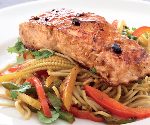 - To serve, place the salmon on the bed of egg noodles