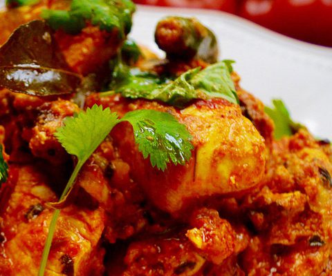 Add the soaked fenugreek leaves, green cardamoms, cloves and tamarind pulp, and place the lid on the pan. Cook for 25 minutes or until the chicken is tender, and the sauce is thick