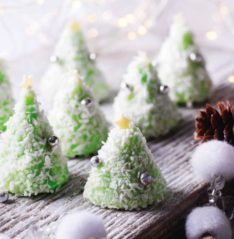 - Shape the coconut ice into balls then flatten the base and pinch the top, gently shaping the ball into a cone shape. Shake the extra desiccated coconut onto a plate and roll each tree in the coconut, making the top of the cone pointy.