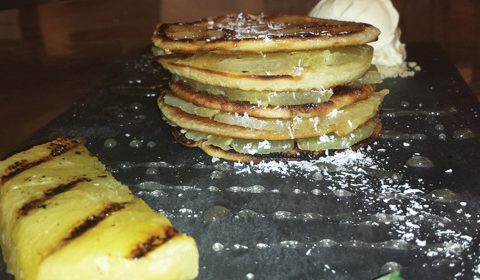 Coconut Pancakes with compressed Pineapple, Malibu Syrup & Coconut Ice Cream