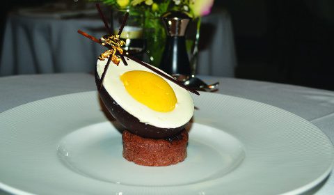 - Cover with white chocolate mousse. Scoop a yolk-shaped portion of passion fruit mousse and place in the centre of the white chocolate mousse