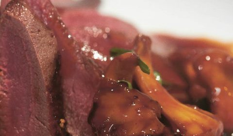 - Deglaze pan with Madeira, add reduced stock and mushrooms, and allow to simmer for approximately 2 minutes