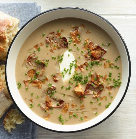 A silky, earthy soup blending wild mushrooms and artichokes, enriched with crème fraîche for a refined, comforting starter packed with seasonal flavour.