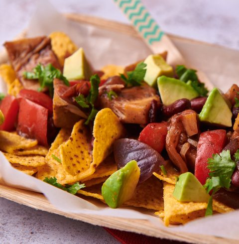 - To serve, scatter tortilla chips across a large plate, top with the jackfruit birria and finish with avocado, coriander and fresh lime wedges.