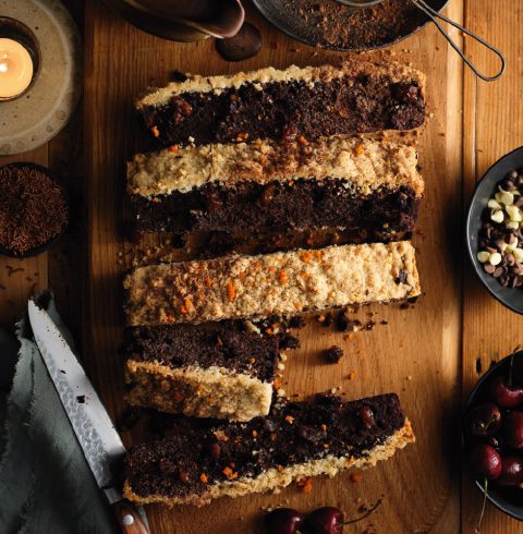 Indulgent chocolate brownies with mincemeat, orange zest and a crumble topping