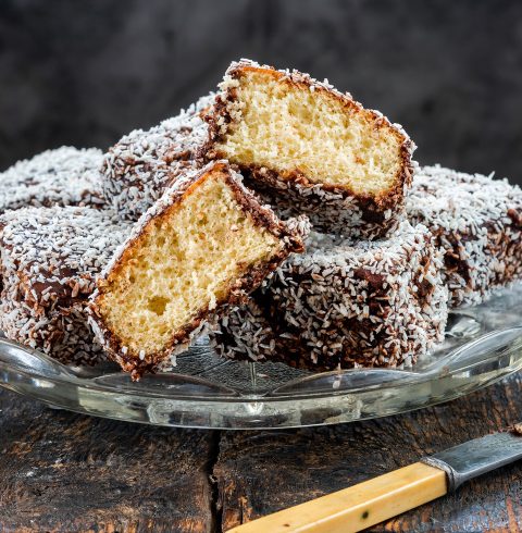 - Dip the lamington sponges in the chocolate glaze and then roll in the desiccated coconut. Place onto a wire rack to set. Repeat the process until all the sponges are coated.