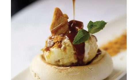 - Sprinkle with crushed puff candy and heat 1 tbsp per portion of sauce and pour over the top
