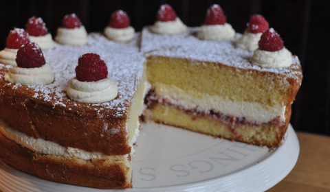 - Sandwich the second layer on top, dust with icing sugar, decorate with fresh raspberries and serve