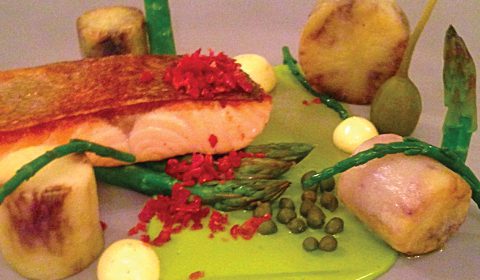 Sea Trout, Shetland Black Potato Fondants, Asparagus Salsa Verde Emulsion & Vanilla Mayonnaise