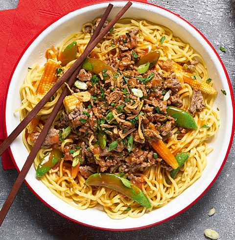- Heat the oil in a large wok on a high heat. Add the pork mince, garlic, ginger and spring onions, and fry for 6-8 mins or until the meat starts to brown. Add the vegetables and cook for a further 2 mins.