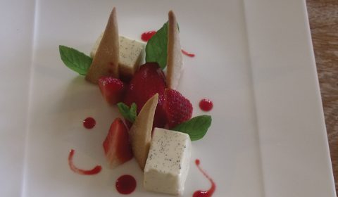 - Cut strawberry, place in and around the sorbet and panna cotta