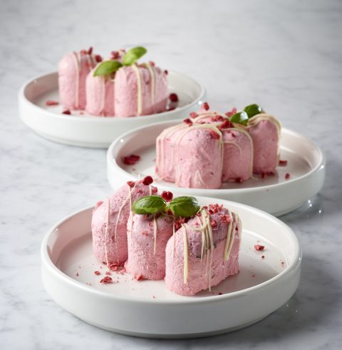 Break the strawberries into small pieces. Melt the white chocolate and place into a piping bag. Remove the strawberry parfait from the mould and cut to the desired size. Pipe on some white chocolate. Place a portion on a plate and garnish with the strawberry pieces to serve