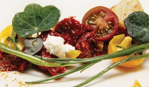 13. Arrange fennel on plate or platter as a base. Place the sun-dried and semi-dried tomatoes around fennel and dress with the goat’s curd, wild garlic pesto and diced gordal olives