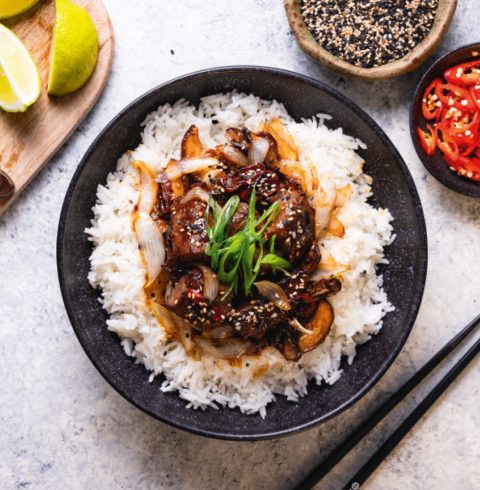 - Serve with the rice and top with spring onions and sesame seeds.