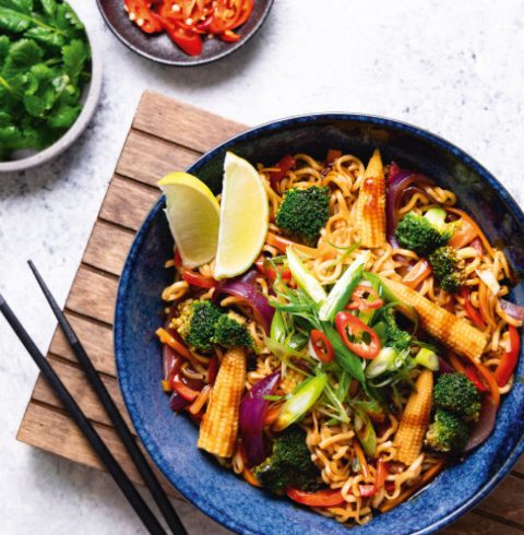 - Add the broccoli, red peppers and baby corn and fry for 3 mins until the vegetables are cooked through but still firm to the bite.