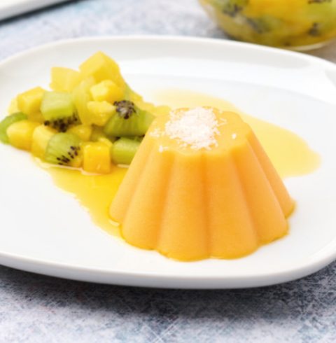 5. Serve with tropical fruit and optional mango juice/coulis.